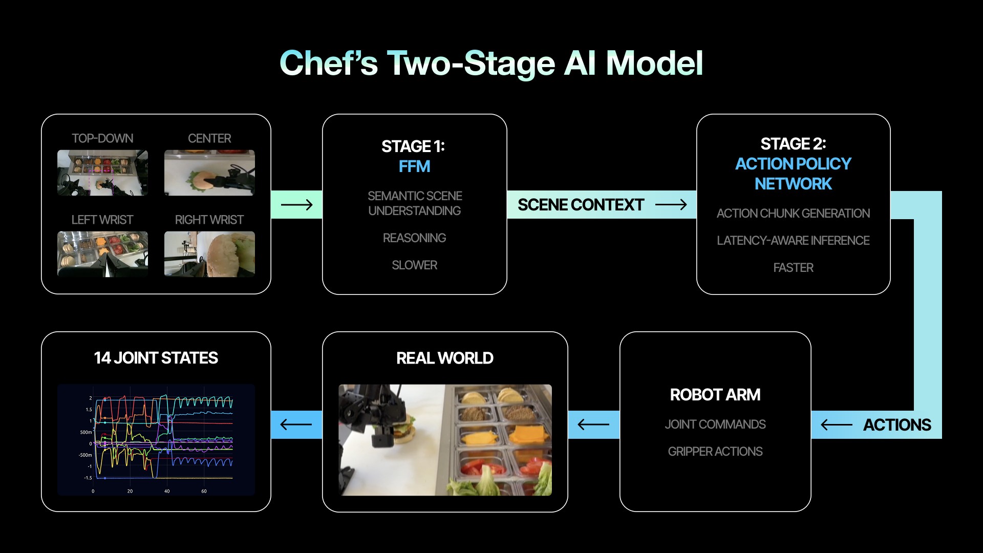 The burger assembly problem is many orders of magnitude more complex than scooping rice into a meal tray. That’s why we built a new physical AI system to solve this challenge—one that doesn’t just reason about the physical world but interacts with it to get the job done, similar to how a human would.
